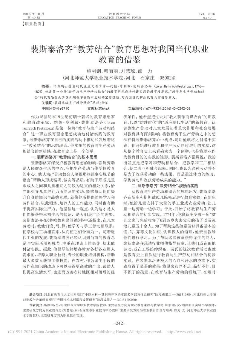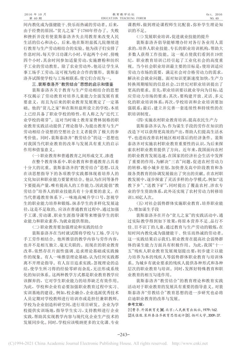 裴斯泰洛齐_教劳结合_教育思想对我国当代职业教育的借鉴